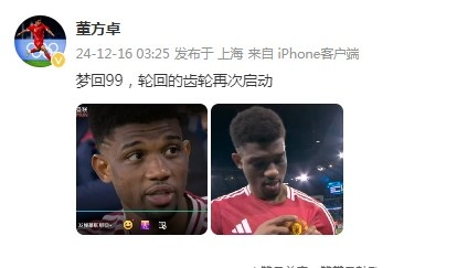 赛后,董方卓在社媒表示,这支曼联让他回想起了99年三冠王时期的曼联,他在社媒写道:“梦回99,轮回的齿轮再次启动!”