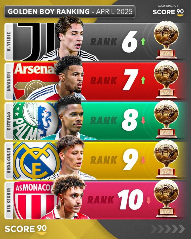 4月19日宣 Score90列出了2025年金童排名,巴黎边锋杜埃居首,库巴西、扎伊尔-埃梅里二三位。