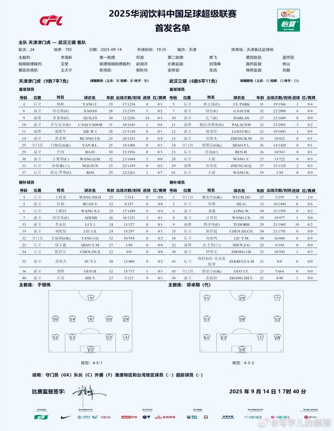 北京时间9月14日19:35,中超联赛第24轮,天津津门虎坐镇主场迎战武汉三镇,本场比赛主裁判是李海新,VAR是艾堃,赛前双方公布首发: