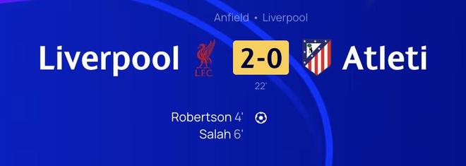 欧冠联赛阶段第一轮,利物浦主场对阵马德里竞技,开场不到5分钟,罗伯逊破门为利物浦取得领先,时隔6年再度在欧冠赛场进球。