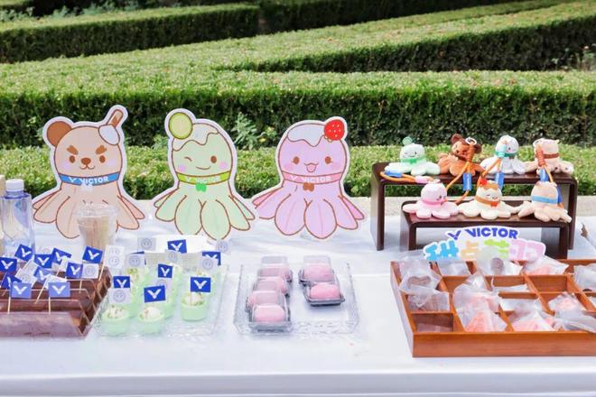 签到墙上挂满了羽毛球,茶歇区装饰着以甜点为灵感的“甜点萌羽”羽毛球挂件,扑克牌也以VICTOR羽球俱乐部系列主题色渲染,就连桌子都是羽毛球场的造型。来到现场的羽球人纷纷感叹,真想把家里也装成这样。