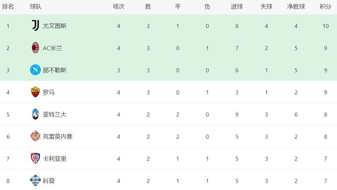 在积分榜上,尤文图斯3胜1平拿到10分排名榜首。AC米兰以9分排名第2。那不勒斯和罗马也都是9分,排名第3和第4名。不过,那不勒斯少踢1场,3场全胜。亚特兰大和克雷莫内塞都是8个积分。国际米兰2胜2负,只拿到6分,排名第10。拉齐奥只拿到3分,排名第13。