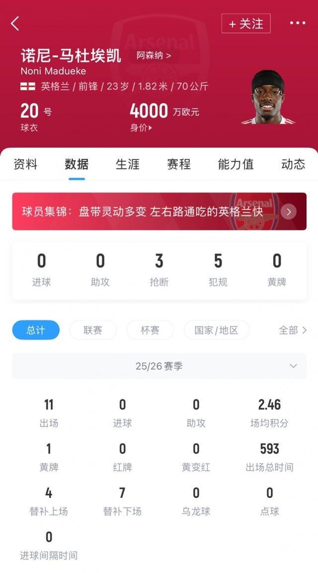 上轮英超阿森纳1-1战平曼城的比赛中,马杜埃凯首发半场被萨卡换下。