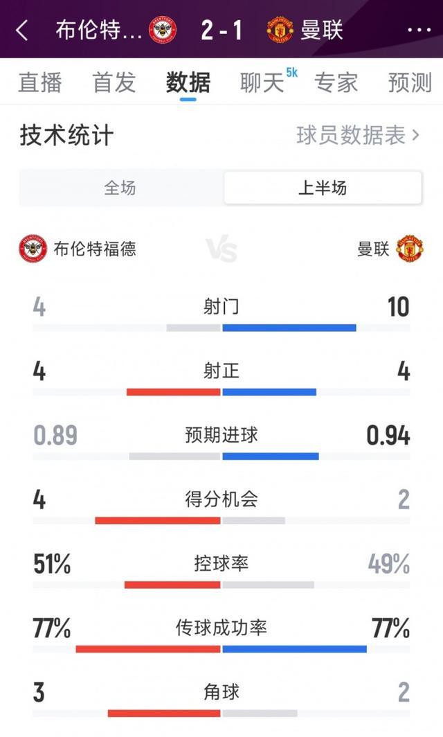 直播吧9月27日宣 本轮英超曼联对阵布伦特福德上半场战罢,布伦特福德暂时2-1领先,以下为双方半场数据对比: