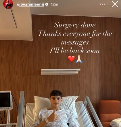 在完成手术后,莱昂尼通过个人社交媒体账号向外界报喜:“手术完成。谢谢大家的支持和留言。我会很快回来的。”