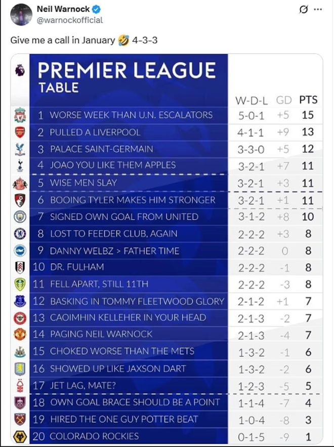 雷速体育10月2日宣 76岁的传奇救火教练尼尔·沃诺克通过社媒(X)发布一份动态,对英超各队的近况进行了调侃。他还用“一月份给我电话”来开玩笑,表示如果曼联解雇阿莫林,他会复出执教红魔。
