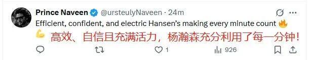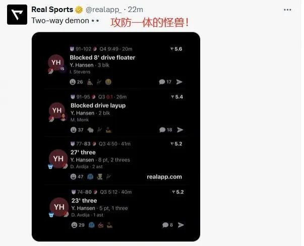 NBA官方推特也晒出了杨瀚森的数据:16分4篮板3封盖!