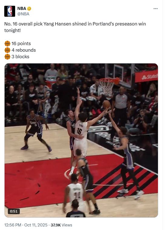 雷速体育10月11日讯 NBA季前赛继续进行开拓者124-123击败了国王,中国球员杨瀚森第三节单节5投全中得到了14分,全场比赛8投5中拿到了16分4个篮板3次盖帽,赛后NBA官推发布了杨瀚森的比赛集锦,大量球迷发布评论感叹杨瀚森表现出色。