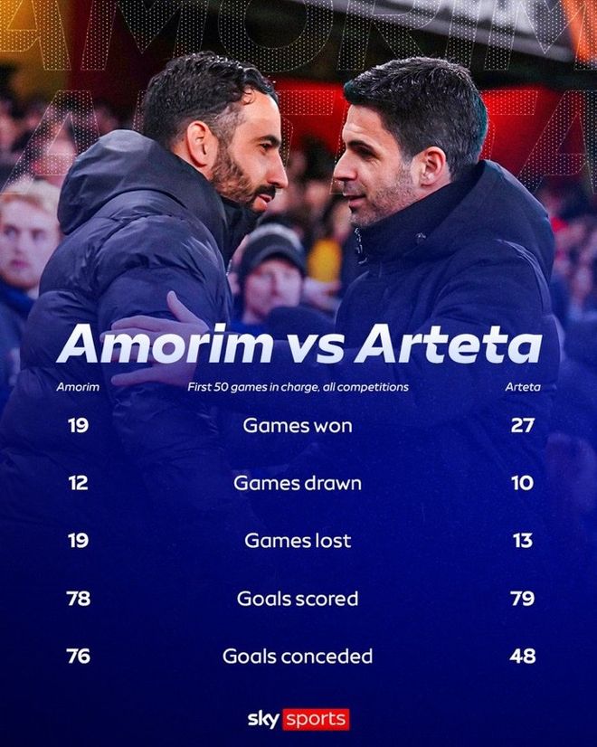 阿莫林执教曼联前50场胜率38%,阿尔特塔同期胜率54%