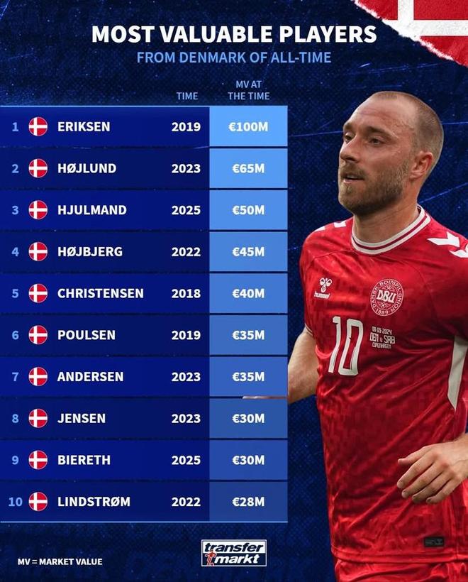 - 英超 | 德转列丹麦球员历史身价榜:埃里克森1亿第1,霍伊伦6500万第2