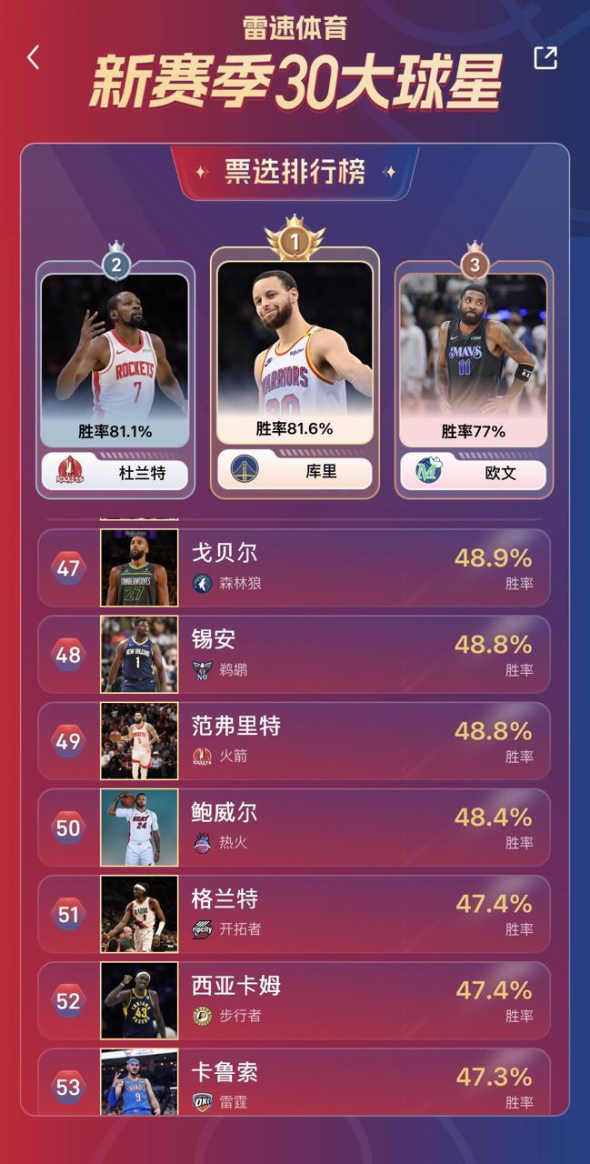 雷速NBA新赛季30大球星即时排名:库里反超KD升至第一