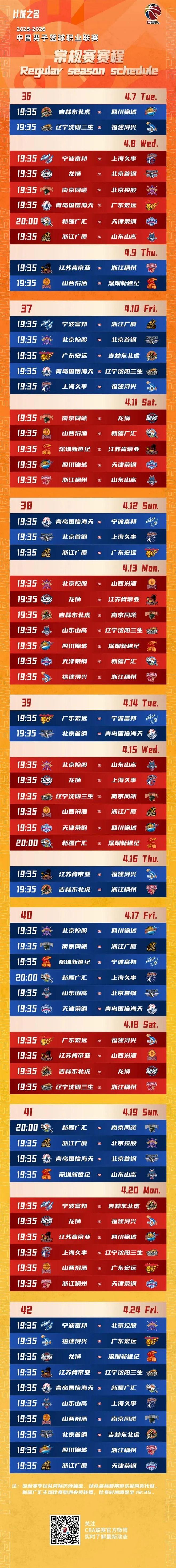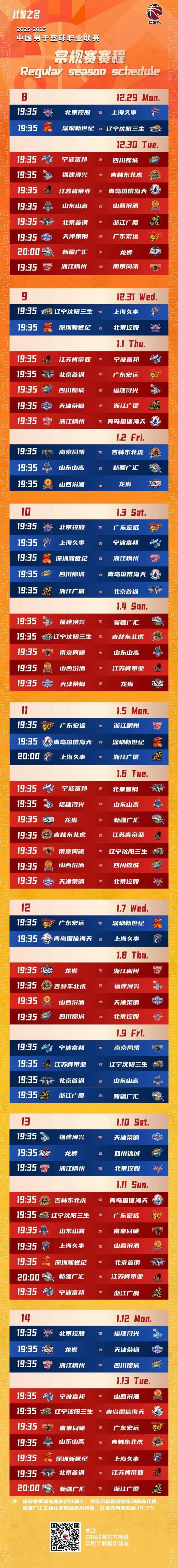 10月20日,CBA联赛公布新赛季赛程,2025-2026赛季CBA联赛常规赛将于12月12日开赛,次年4月24日收官,常规赛共42轮。