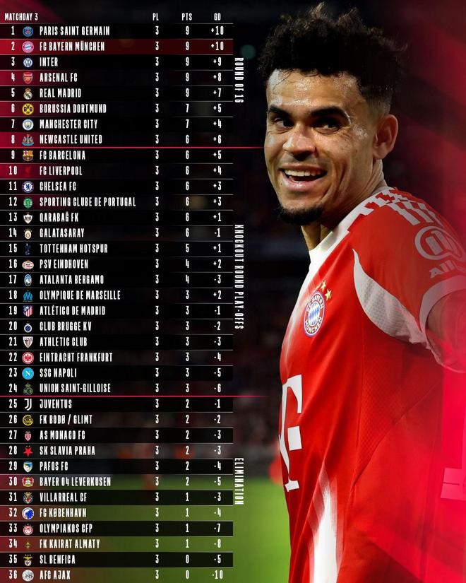 欧冠联赛阶段前3轮过后,拜仁三战全胜,打进12球丢2球,仅因进球数的劣势暂列第二。目前排名第一的则是同样三战全胜,打进13球丢3球的巴黎。