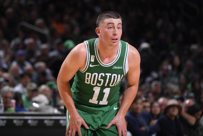 上半场比赛中,凯尔特人队内三人得分上双,布朗出战15分钟,得到23分;普里查德出战17分钟,得到10分;西蒙斯出战14分钟,得到10分。