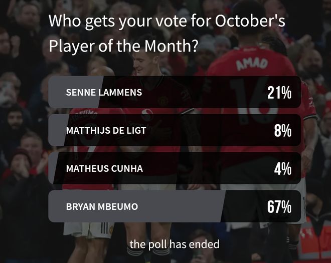 姆伯莫以67%的得票率胜出,远超拉门斯(21%)、德利赫特(8%)和库尼亚(4%)。这位喀麦隆国脚在2-0战胜桑德兰的比赛中为梅森·芒特精彩的首开纪录送出助攻,并在安菲尔德对阵利物浦那场难忘的2-1胜利中,仅用一分钟就帮助曼联取得领先。