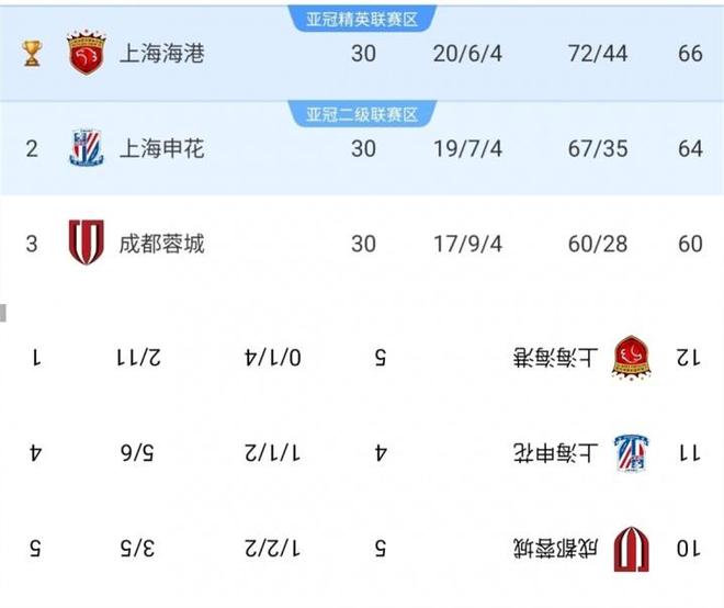 有人弄了一个中超和亚冠倒转榜(上图)。这一转就看出门道:中超是海港第一,申花第二,成都蓉城第三;到了亚冠这排名则倒转过来:成都蓉城5分第一,申花4分第二,海港1分排名第三。