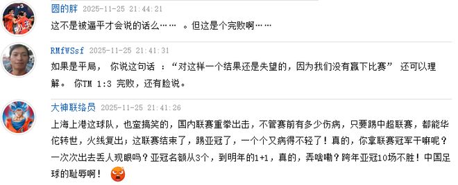 对于海港习惯性踢亚冠时有主力缺阵,有球迷神评可谓入木三分。写道:国内联赛重拳出击,不管赛前有多少伤病,只要踢中超联赛,都能华佗转世,火线复出;这联赛结束了,踢亚冠了,一个个又病得不轻了!真的,你拿联赛冠军干嘛呢?一次次出去丢人现眼吗?亚冠名额从3个,到明年的1+1,真的,弄啥嘞?跨年亚冠10场不胜!中国足球的耻辱啊!