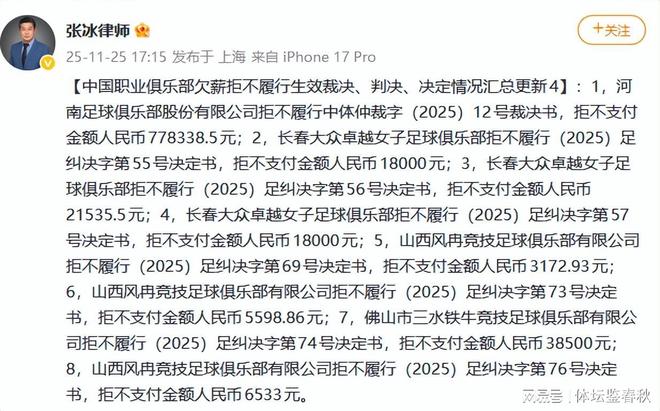 就在河南队全力备战足协杯比赛的时候,一个负面消息传来,近期某律师在社交平台上发文称,河南队未按中国足球协会仲裁委员会于2025 年作出的“中体仲裁字12号裁决书”支付应付金额人民币778,338.5元。虽然77万余元对于像河南队这样的老牌职业俱乐部来说并不算多,但还是暴露出了中超俱乐部在管理方面出现的短板。
