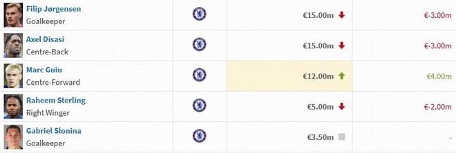 切尔西球员身价变动:埃斯特旺上涨2000万欧,德拉普下跌500万欧