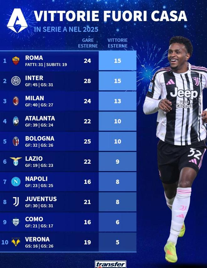 - 意甲 | 意甲球队2025年客场成绩:罗马、国米15胜第1,尤文21战仅8胜