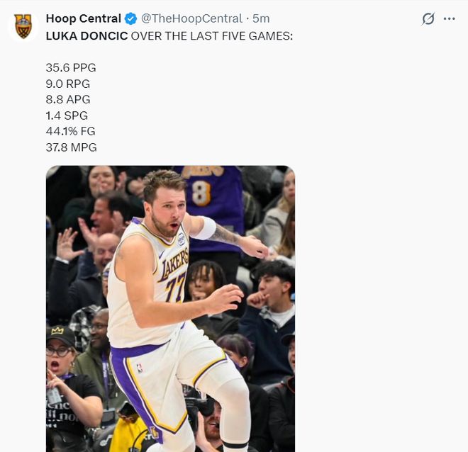 过去五场比赛东契奇场均35.6分9篮板8.8助攻1.4抢断,命中率44.1%,他本赛季很有希望拿到联盟的得分王。