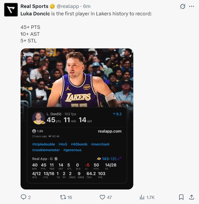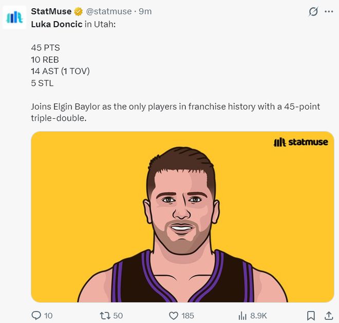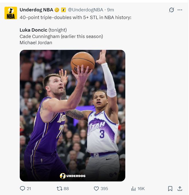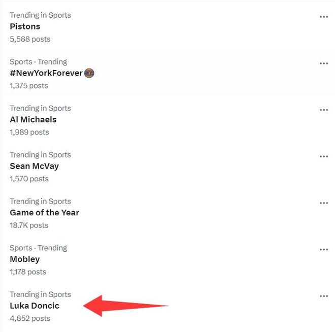 东契奇这场比赛后也顺利登上了全美体育热搜榜单,他的个人表现是这一天NBA中最劲爆的,早些时候他刚刚入选了NBA杯赛最佳阵容。