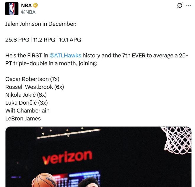 12月份杰伦约翰逊场均可以轰出25.8分11.2板10.1助1.1断三双数据,三项命中率52/34/90%,成为NBA历史上第7位单月至少交出25+三双球员。