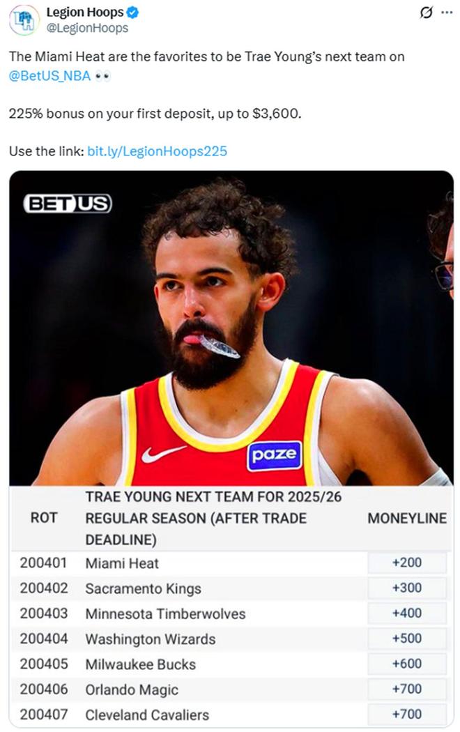 而在美媒公布的特雷杨下家赔率中,热火高居第一,国王、森林狼分列2、3,奇才、雄鹿、魔术和骑士排在4-7名。