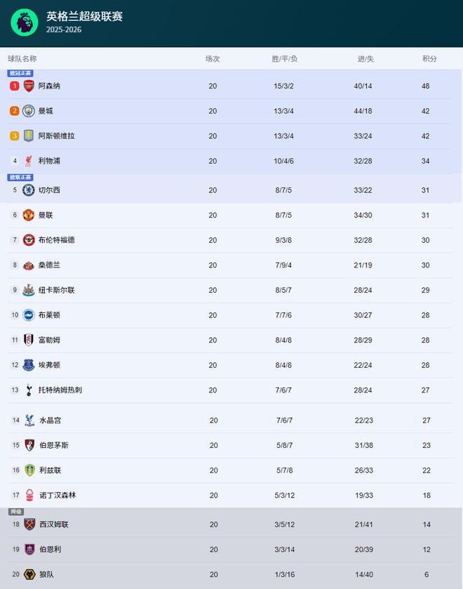 - 英超 | 英超第21轮:阿森纳00利物浦,继续6分领跑