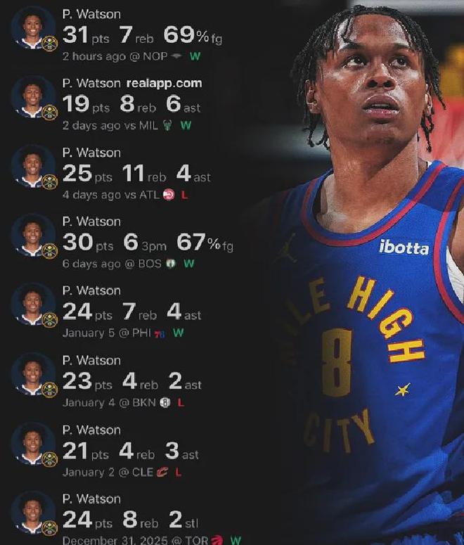 除此之外,佩顿-沃特森也值得大吹特吹,作为22届首轮第30号秀的他本赛季迎来大爆发,近十场比赛八次单场得分20+,已是掘金可以信赖的稳定进攻火力点。
