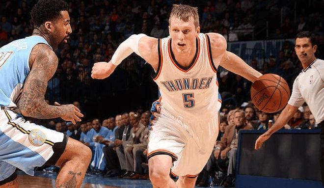 不得不说,小球时代的到来,确实让辛格勒得到了喘息的机会,毕竟整个NBA生涯的三分命中率达到了36.2%,产量也还不错,所以虽然在活塞队只打了2个多赛季,但还是得到了雷霆队的青睐,在14-15赛季的交易截止日前,他被雷霆队引进。